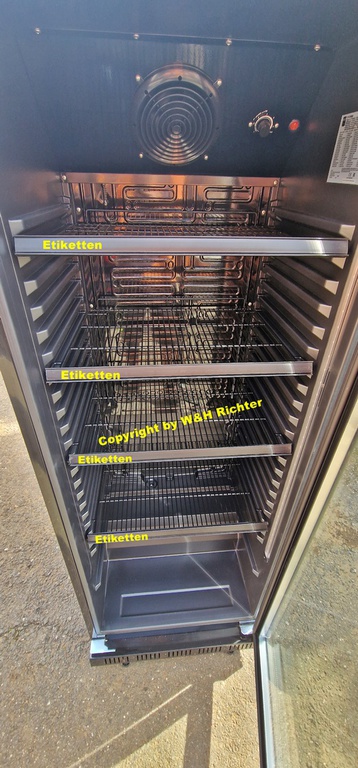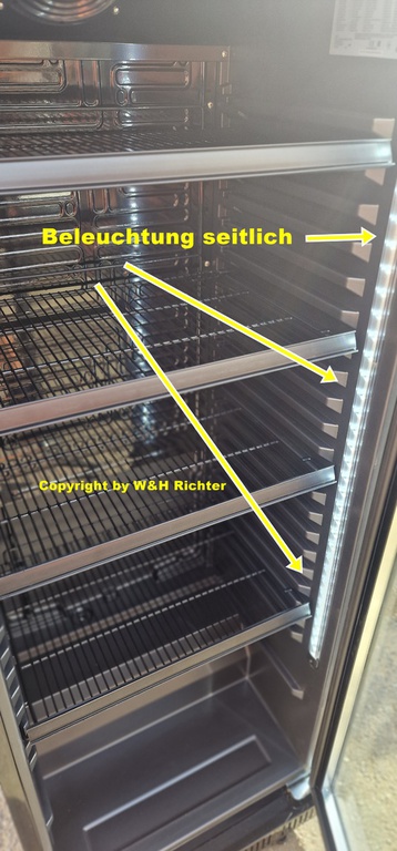 Mit Beleuchtung oben , Seitenbeleuchtung innen . 4 Ablagefächer , falls benötigt Etiketten Leisten .